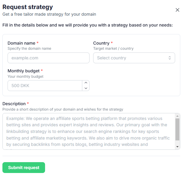 To request a strategy using the Bazoom strategy builder, you first need to sign up for a free account or log in to the marketplace. Once you are signed in, you will fill out a simple form with key details about your domain and preferences. This ensures our SEO experts can create a free, tailor-made strategy that fits your needs.